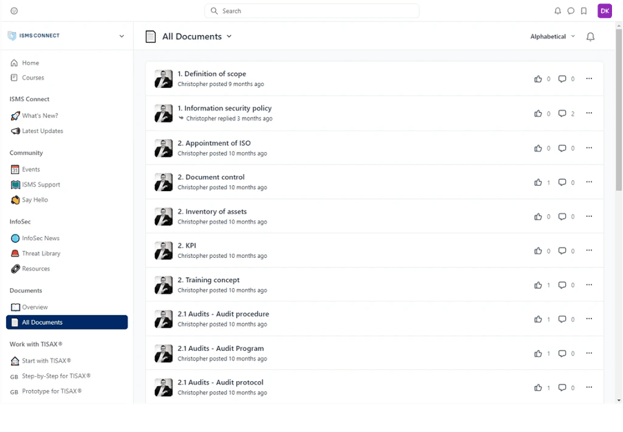 ISMS Connect hilft Unternehmen, ein konformes ISMS aufzubauen und schnell Zertifizierungen zu erhalten. Unsere Plattform kombiniert DIY-Leitfäden, Vorlagen und Anleitungen mit On-Demand-Expertenunterstützung und einer aktiven Community, um sicherzustellen, dass Ihr ISMS auf dem neuesten Stand und auditfähig ist.