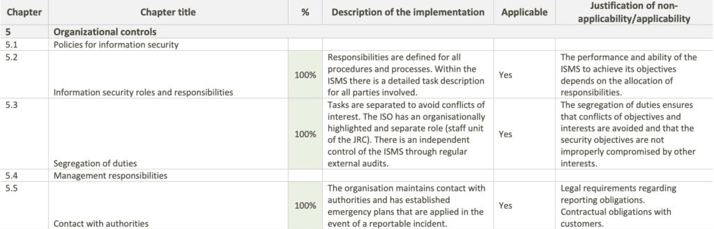 The SoA is a short document that has a row for each control (controls from Annex A, plus the added ones), making it possible to present it to management and to keep it up-to-date. This makes it easier to manage information security risks and prioritize security efforts.